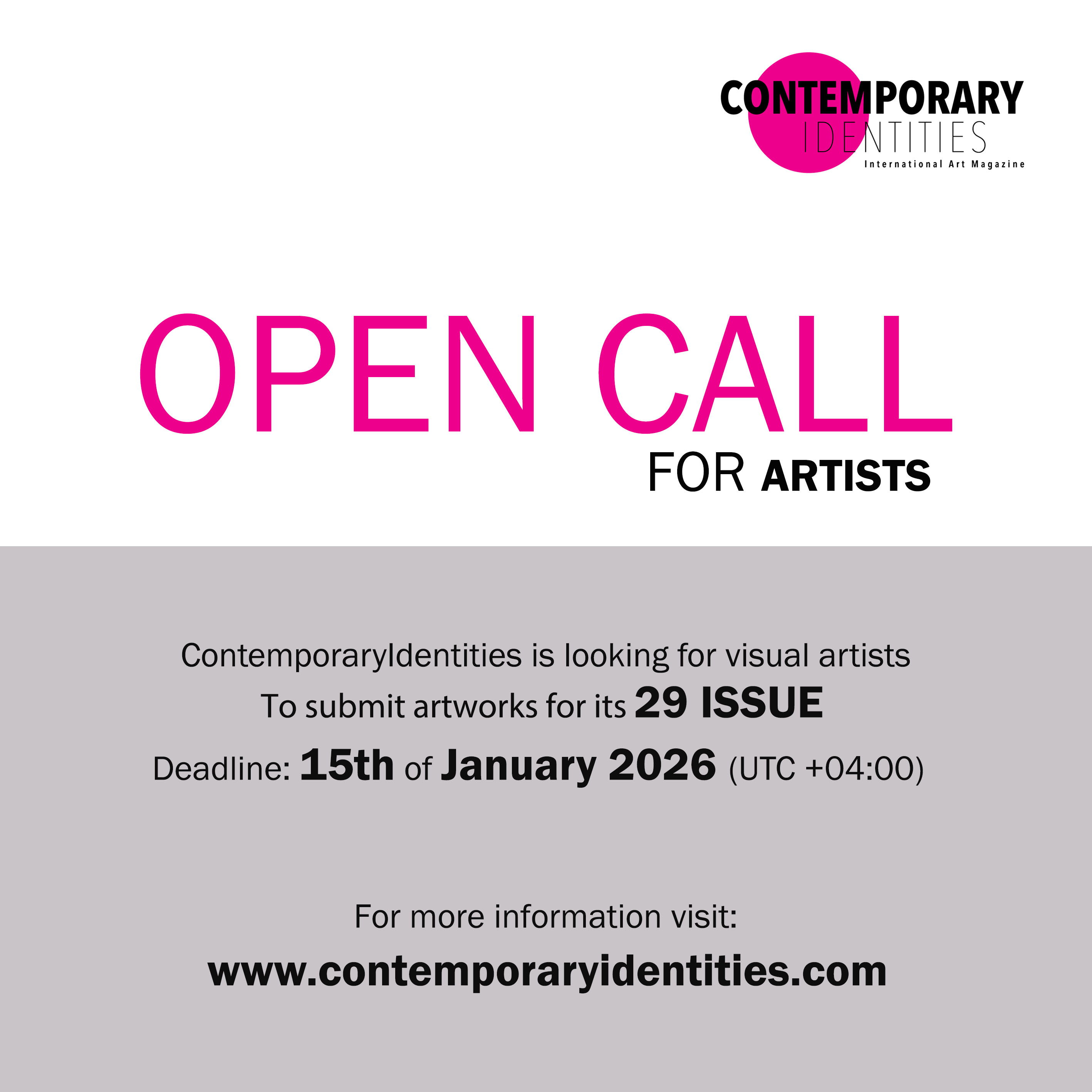 ContemporaryIdentities is an independent quarterly international online magazine covering contemporary art from around the world. The focus of ContemporaryIdentities is to showcase and promote experimental and progressive contemporary art through short art reviews from international scholars, art writers and art critics who are invited regularly to contribute to this publication. Alongside invited contributors, there will be selected artists interviews and open call for internationals artists, graphic designers and art critics.